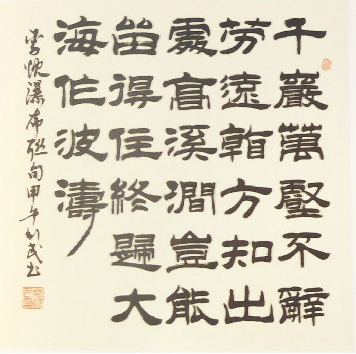 从书法观念上说,张行民属于“传统派”。在传统中国美学中,刘勰《文心雕龙》中所谓“刚健既实,辉光乃新”是最为健康的生命情调体现。“魏晋风度”的一个非常重要的审美标志就是人的“骨气”,无骨气,则算不上风度。中国艺术从它的凌空高蹈之际,就以骨为美,以气为尚。书如其人,张行民书法颇显其“骨”与“气”,他的隶书胎息于历代隶书大家的标准书风,取法与刘炳森先生的隶体风格。为领会贯通隶体的本真,他读帖临帖如醉如痴,近来参以名家的大气雍容,风流表格,经过一番整合已初显“刚健既实,真力弥满”的个性风采。从字法上讲,他取诸家“简约”之长,以魏体的凌空取势、大气超拔以补其不足。从笔法上分析,他惯用高管长锋执中守意,凌空高蹈,笔力遒逸,骨气峻迈。读他的字,可以感受到生命气象的流落、情感意绪的喷发,正是一种趋于壮美意向的审美生发。若再从点画的线性质感来看,张行民近作的最大特点是“遒劲厚重,刚健纵逸”。在创作中,情绪的激扬往往左右了他对毛笔的掌控,在控制与时空中,他完成了笔与笔的连带,线与线的绾结,因此从整体作品看来,浑然一气,毫不掩饰其一泻千里之概。