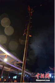 12月6日夜晚,在广西金秀瑶族自治县,瑶族百姓在盘王节上当地展现瑶族民间绝技——上刀山