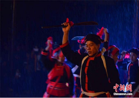 12月6日,在中国瑶族之乡广西金秀瑶族自治县的盘王节上,当地瑶族百姓在跳”刀舞”