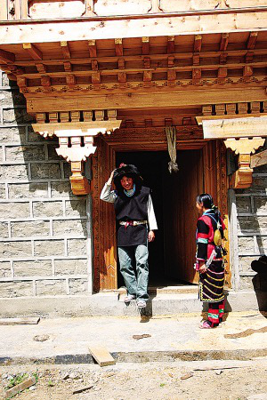在珞巴族家中,男主外,女主内,分工相当明确。当达瓦在家里和我聊天时,他的妻子群宗一直在忙碌着,忙着给我打酥油茶,忙着生火烧水、煮土豆,忙着照顾孩子。为了让我能拍一张达瓦一家人穿珞巴族服装的照片,大家费了好大劲儿。他们从东家借来帽子,从西家找来褂子,也有从南家借来的饰品……终于,达瓦和群宗夫妻俩都穿戴上了本民族的服饰,我如愿以偿地给他们拍了一张全家福。