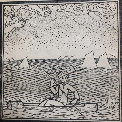 厄霞看见札努札别依然没有饿死,又想出了一条毒计:他把天河上的水放下来,整个大地变成白茫茫一片汪洋大海。跑到高山去的人侥幸没有淹死。住在平地上的人,都被洪水淹死了,厄霞以为这一次札努札别也一定淹死了。但当厄霞来看时,札努札别坐在掏空了的木槽里漂在水面上,依然没有淹死。于是,原来不知道造船的人们,从这次起,后世便知道造船了。
