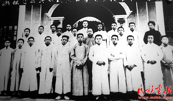 山东省立第一中学第三期全体学生会职员合影,前排右四为邓恩铭