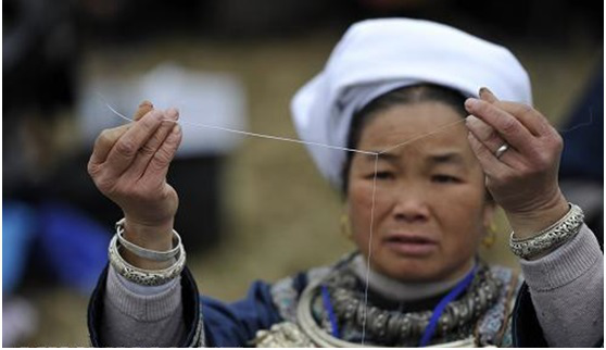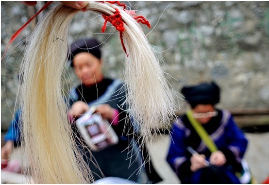 第二步是制作马尾线,这是马尾绣最基础的步骤,精心选择2-4根长短、粗细相当的马尾合股后做内芯,用白丝线以相反方向搓裹马尾,做成纯白光亮、硬度适中的马尾丝线。