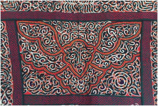 而在背儿带下部的中心图案则是一个古老的传统纹样。主体形象以同心圆为主,里面的几何装饰图案依次向外扩散,就像太阳的光芒一样向四周散射。圆是一个太阳,里面有一棵树,即小孩的生命树,寓意生命之树长青,树上有一颗石榴花,寓意多子。太阳周围彩带状纹样代表雷鸣与闪电。雷神的地位在水族社会中是至高无上的,能主持正义、惩恶扬善。背儿带上绣雷鸣便是祈求雷神对幼儿的庇佑。太阳纹与雷神的象征图案组合,是水族自然神崇拜信仰的写照。太阳图案上下绣有两只大蝴蝶,左右各绣一只老鹰。下部的四角是葫芦纹,葫芦的形象源于水族的创世神话。天地初始之时洪水泛滥,作为水族先人的兄妹二人为了躲避洪水,栖身于一支大葫芦中,直至洪水退去。兄妹二人走出葫芦,结为夫妻,繁衍生息,才有了今日成千上万的水族儿女。于是,葫芦被赋予了繁衍、生殖的意义。