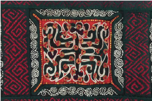 背儿带上端的背带手上绣有连续的螺丝纹。水族是南方的稻作民族,而螺蛳是水田中常见的动物,其繁殖属性为多产。心灵手巧的水族女性将日常生活中的动物形象,经抽象变形而变成简练的纹样,象征着生命的不断繁衍。