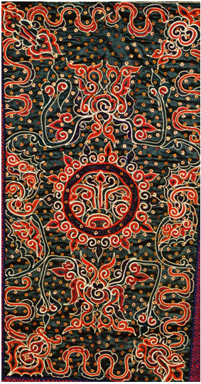 第四步是刺绣,包括三个环节,即固定框架图案、填芯和镶边。固定框架图案,即用一根大针将马尾线穿好,再用另一根稍小的针穿上同色丝线,然后一边用马尾线在布面上镶成各种图案,一边用穿有丝线的小针将图案固定在布面上。填芯,即用各色丝线将固定好的图案空隙部分填满。镶边,即用橙色和黑绿色丝线在四周挑绣成镶边图案。