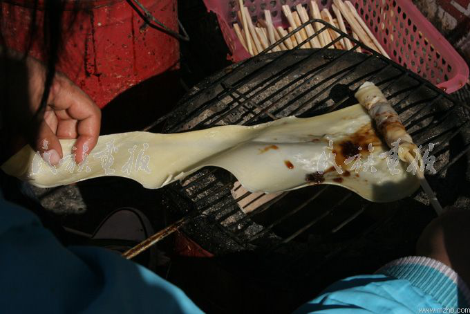 街边小摊上的烤乳扇,风味别具一格,烤的时候要涂抹玫瑰糖