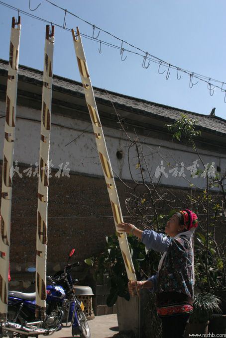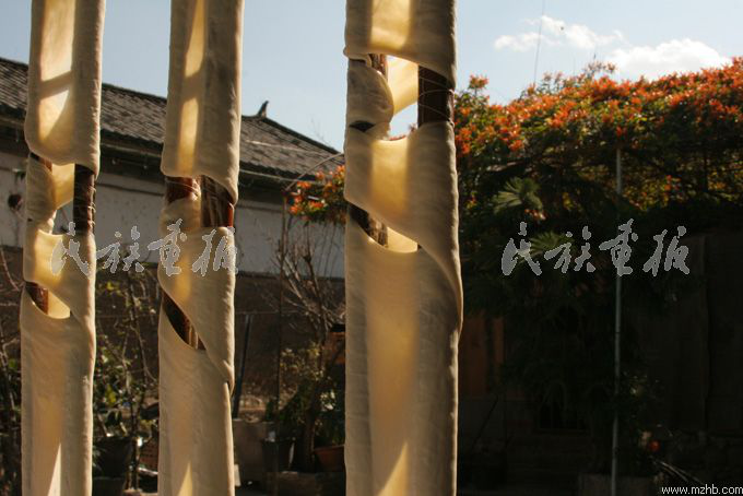 冬日里的一个午后,我来到蝴蝶泉边的周城村,在一户白族人家里探访了乳扇的制作过程。刚到大门口,就闻到一股淡 淡的乳香。走进院子,只见一位白族妇女正举着一根长长的杆子往老高老高的铁丝上挂,院子里挂满了一排排白花花的像是裹着白布的竹杆。走近一看,杆子上白白的东西并不是白布,向导告诉我,这就是乳扇。