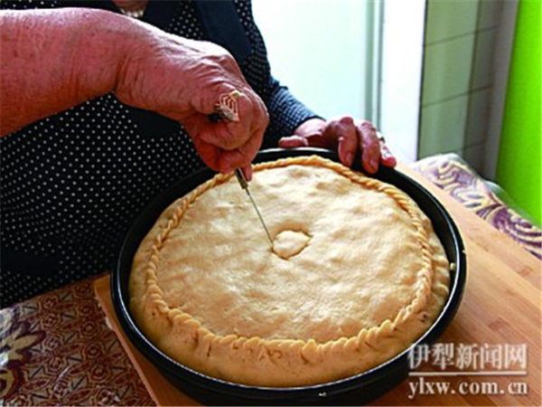 这段时间,就可以拌馅了。买斯胡旦向先前放在一旁的羊肉、土豆和洋葱中加入一些盐和黑胡椒粉,搅拌均匀。肉与黑胡椒粉相融的辛辣香味已经开始漫溢。接着继续揉面。将醒好的面分成大小两块。大的做底,小的做顶。待大小两块面都擀成圆形薄饼状后,就将底子铺在托盘底部,多出的部分紧紧扣合托盘边缘。然后倒入馅料,铺平,加盖,将上下两层面饼悉心捏合成好看的花边。最后,在面饼中间掏个洞,切下的面团做成小壶盖,再原位放到上面。壶盖的作用在于等面饼烤至表层泛红时,将其端出,取下壶盖,加些许开水进去。“拜列西很厚,里面的料很多,要是水干了,就不容易熟。”买斯胡旦解释。做完这一切,就可以将托盘放进烤箱了,调整烤箱至200℃的火力就够,这样,经过2个小时的烘烤,外酥内软,香而不焦的拜列西就烤好了。