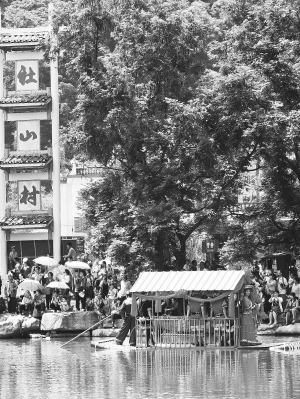 广西桂林恭城瑶族自治县“五一”期间在平安乡社山村、莲花镇红岩村等旅游景点,举行了瑶家小锅米酒坊、原生态腐竹制作体验、瑶族水上婚嫁表演等活动,丰富了群众的文化生活。图为独特的瑶族水上婚嫁表演,吸引了许多游客驻足观赏。