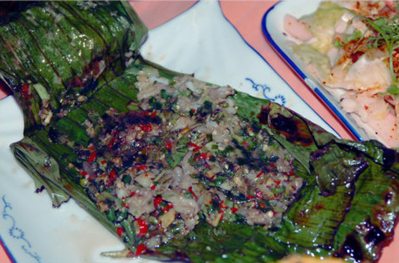傣族传统家常风味菜,特点是软嫩鲜甜,原汁原味。制法是将鲜鱼去鳃和内脏,洗净,将葱花、姜末、蒜末、青椒末、青姜叶末、芫荽末、野花椒叶末、薄荷、茴香叶末、香茅草叶末、草果粉、味精、盐、料酒拌制成馅,装入鱼腹,头尾折拢,再用香茅草捆成十字,外面包以芭蕉叶,埋入木柴烧后的炭或热灰中烧熟,取出去掉芭蕉叶和香茅草,装盘即成。
