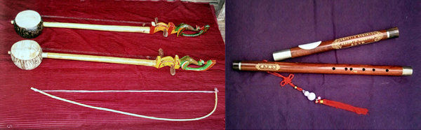 傣剧是在傣族民间歌曲和歌舞音乐的基础上发展起来的,并借鉴了汉族戏曲艺术的表现手段,流传于德宏、保山、临沧等傣族聚居区。傣剧包括多种男女唱腔,男腔多用羽调式,女腔多用徵调式。20世纪50年代以来,傣剧吸收了多种傣族民歌和舞曲,丰富了唱腔,增强了音乐的表现力。傣剧唱腔基本是上下句组成的乐段及其变化反复。由于唱词字数可多可少,因此唱腔乐句长短不一。过去,傣剧只用小堂鼓、锣、镲等伴奏,后逐步采用了多种民族乐器及西洋管弦乐器,组成新型的傣剧乐队。傣族的民族乐器属于吹奏乐器的有筚、葫芦箫(如图)、竖笛、木叶等;弹拨乐器有玎琴、口弦等;弓弦乐器有西玎(玎琴)、牛角玎(牛角琴)等;打击乐器有象脚鼓、光隆、光边、光邦、锣、镲等。象脚鼓、锣、镲的合奏是傣族器乐合奏的主要形式。