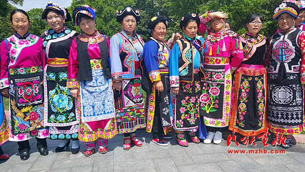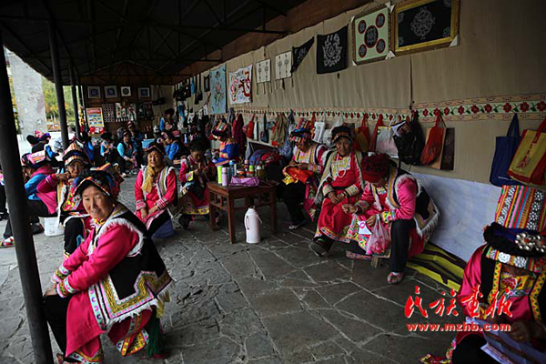 在文化广场表演舞蹈与体育竞技的间隙,羌族男人们喝茶休息,妇女们则拿出身边的针线,忙里偷闲做一些针线活。几十位穿着民族服装的妇女坐在一起忙碌的场面犹如一道靓丽的风景,吸引不少游客前来拍照,了解羌绣文化。来自叠溪镇太平乡的59岁妇女雍坤玉告诉我,她们在工作之余还绣鞋垫,绣品可以出售。羌绣工艺复杂,绣品质量好,很受游客青睐。