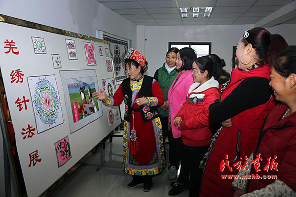 在古羌城采访时,我遇到了两位在西南民族大学举办的“国家文化部非物质文化遗产——羌族刺绣”培训班上认识的熟人,她们都是羌绣这一非物质文化遗产项目的传承人。其中一位是四川兴绣藏羌工艺文化发展有限公司的董事长李兴绣,她正在古羌城的传习中心给阿坝州刺绣能手授课。这是一个精准扶贫的项目,目的是帮助羌族妇女靠刺绣手艺发家致富。李兴绣说,她正准备和有关部门商议策划,准备建一个以羌绣为主题的专门展示厅。