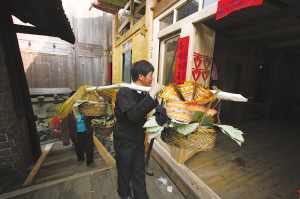 新娘离开娘家时,女方不仅要送单数的鸡、鸭,如5、7、9只,就连给男方所挑的陪嫁品担子也必须是单数的。