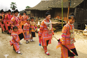 对于对角花苗族来说,每年最隆重、最盛大的节日就是“结婚节”(苗语称“艾开”)。“结婚节”通常定在农历十月至十一月间的好日子,即“丑日”。本支系青年男女的婚礼,一般都在这天举行。节日的第二天,有“结婚过年”习俗的对角花苗族,也就迎来了崭新的“大年初一”。