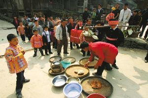 我们尾随着娶亲队伍进寨,发现寨子中间的路上也摆着很多簸箕、脸盆之类的容器,原来,村民们也要“讨赏”呢!听高邦寨的村支书说,遇到这种情况,路人放的东西越贵重,娶亲队伍留下的肉食就越丰盛,有时甚至会放下一整只鸡或鸭呢!
