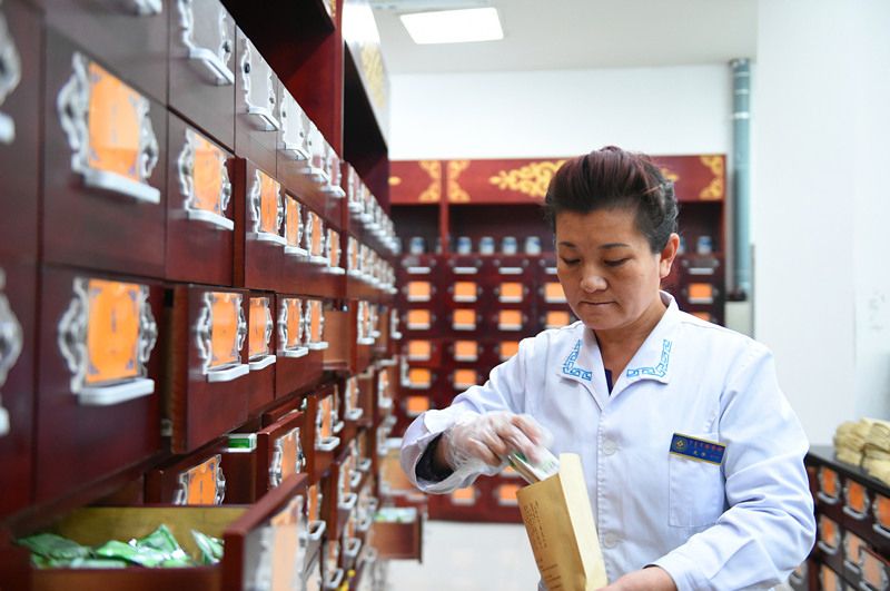 内蒙古国际蒙医医院蒙药师在药房抓药