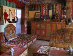 藏族民居室内装饰讲究工整、华丽、亮堂,上至天花板下至与地板相接的墙角都采用雕刻、彩绘等艺术手段加以装点,尤其是横梁、柱头和大门等木结构空间是充分展示装饰才能的地方,在这里装饰效果尽其所能。此外寺庙重点佛堂,回廊墙壁上绘制彩画,这也是一种重要的装饰手段,而百姓居室内的墙壁上用绘制花卉、彩条来取得装饰效果。