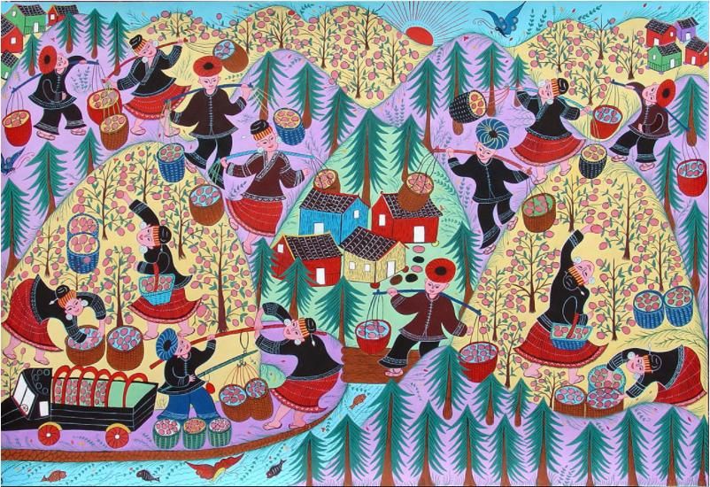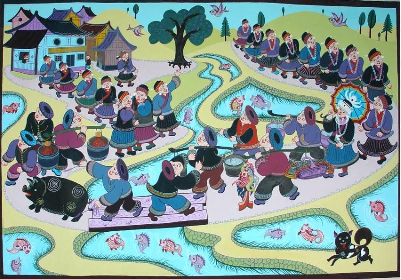 剑河现代民间绘画源于传统的苗族刺绣文化,是苗族刺绣文化的另一种表现形式和艺术升华。传统的苗族文化多以服饰、歌舞为载体,并以刺绣及演唱等形式进行表现和传承。早期剑河现代民间画即脱胎于具有适用性的苗族刺绣样稿——剪纸和手绘刺绣粉本,换言之,手绘的苗族刺绣粉本便是剑河现代民间绘画的雏形,剑河第一批优秀的现代民间画作者,即是原当地手绘粉本的能工巧匠。剑河现代民间绘画多以苗族神话传说中的故事情节和民俗节日、生产活动等内容为题材入画,素材涵盖自然界花鸟虫鱼及人物、家畜等具体形象,造型稚拙天真,设色浓艳,对比强烈。作品传达出典型的地域民俗气息及浓厚的乡土味,便是其标志性特征。