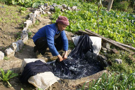 从前壮族乡村,普遍掌握制作蓝靛及印染方法。一般置一大缸,将蓝草放入浸泡,加石灰使之分解、发酵,经过化学变化,而后滤去残渣,蒸发水分,凝成糊状蓝色染料。其间需不断搅动,使色素充分化解。“每靛草六百斤,造成一百斤之靛为佳。”因产量较多,远销广东。浸染时,将适量靛糊化于染缸中,同时将鸡血藤捣碎加入。布要反复浸泡多次,晾泡结合,直到染为深蓝色。其间鸡血藤释放出一种紫红色的植物胶,将蓝靛色素粘在纤维上,是色素耐水耐腐耐紫外线,不易褪色,并有若隐若现的亮点,结实美观。这个过程,运用了化学分解法。