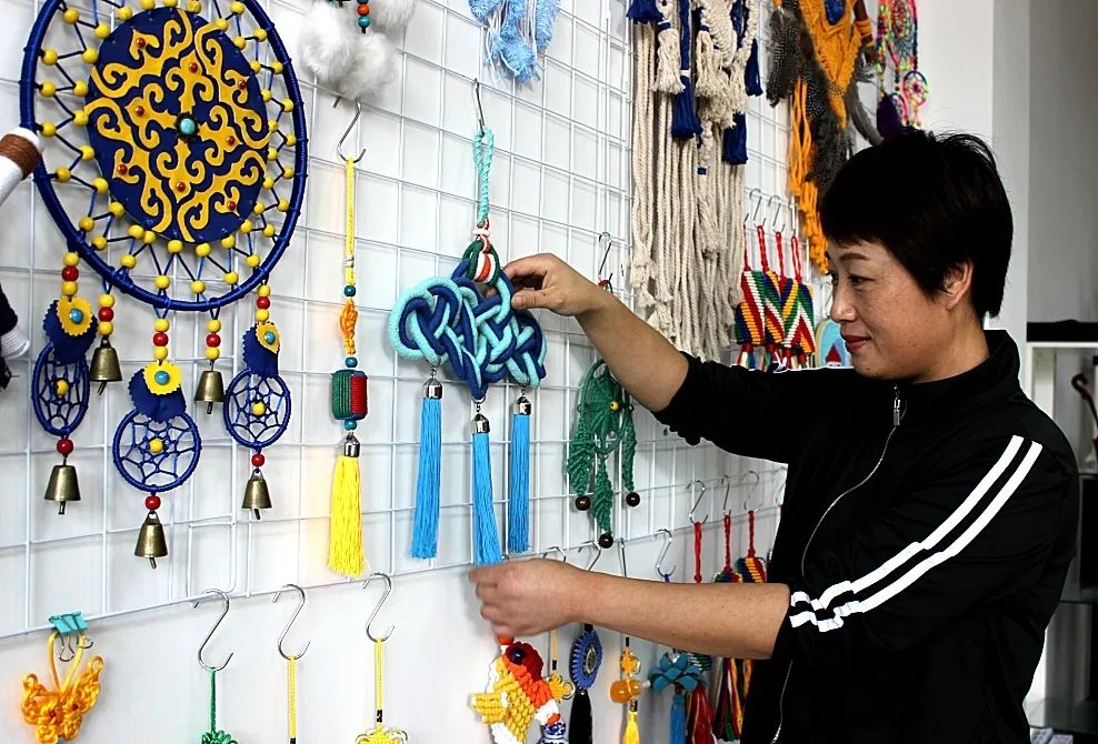 此外,绳结技艺传承人把传统工艺带去了乡村,让传统手工艺也成为了扶贫的一种助力。她们组织村里的妇女进行培训、学习。通过手工艺术村里的妇女们有了生存的技能,目前大多数村民及贫困户在第一次培训的基础上,已经充分掌握了绳结技艺,能够编织出一个合格的绳结产品,变成了名副其实的“巧娘”。她们扶贫村有协日塔拉嘎查、四方地村等。