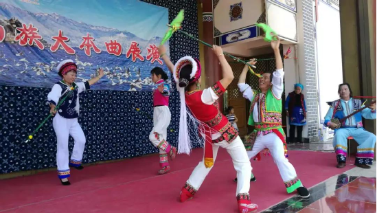 庆洞村有一支白族绕三灵文艺队,全都由村里的文艺爱好者组成,何松康是文艺队的主力。“全队20多人,霸王鞭都是我带出来的,都可以算作我的徒弟,平时没事大家就一起练习表演,有活动了就一起参加活动,传承传统文化的同时,还可以补贴一点收入”,何松康说。